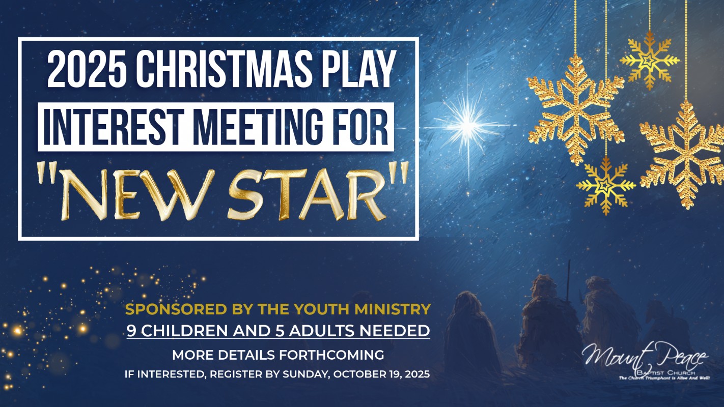 If you’re interested in being part of a 2025 Mount Peace Christmas Play entitled “The Star” sponsored by the Youth Ministry, please register by Sunday, October 19th. 9 adults and 5 youth are needed.