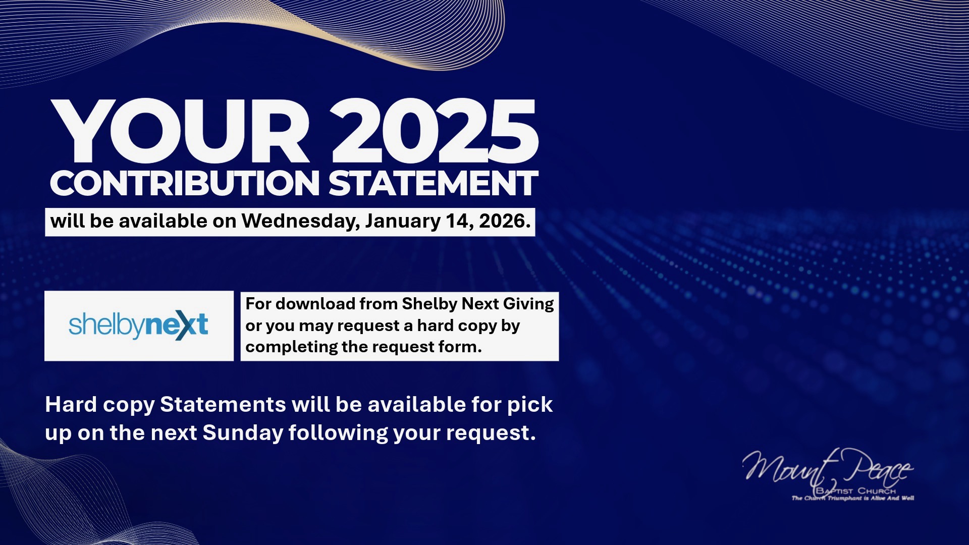 Your 2025 Contribution Statement will be available on January 14, 2026 for download from Shelby Next Giving or you may request a hard copy by completing the request form.