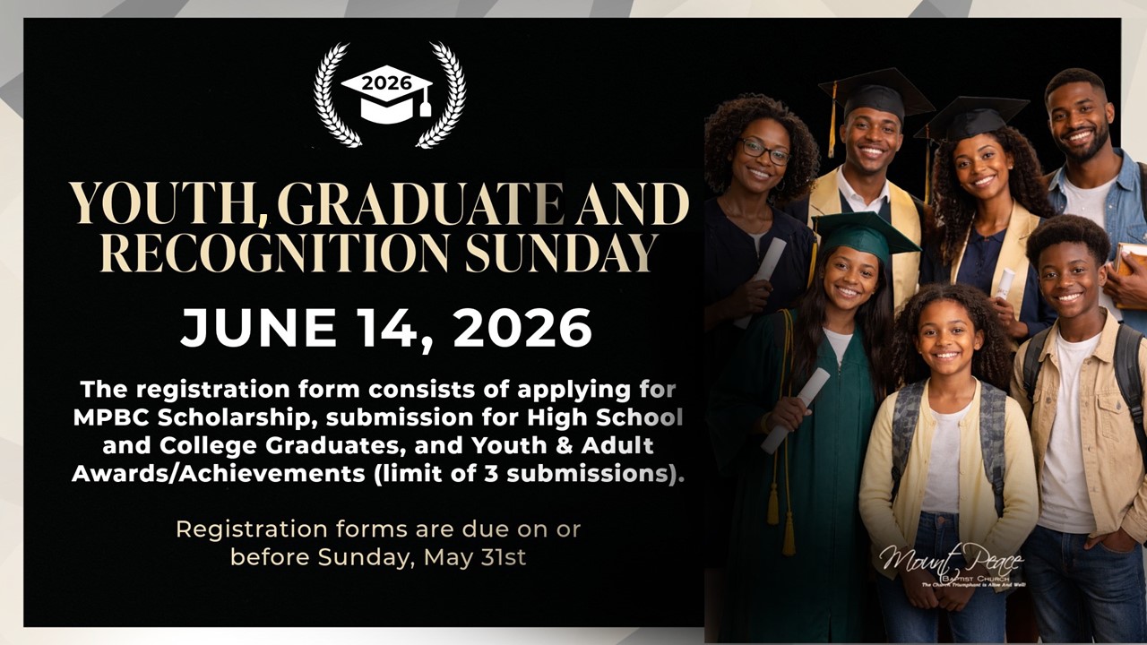 As we prepare to recognize our Mount Peace Youth and Adults for their outstanding accomplishments, the recognition and special ceremony for all participants will be held during the 11:59am Worship Service. Additional details will be provided soon.