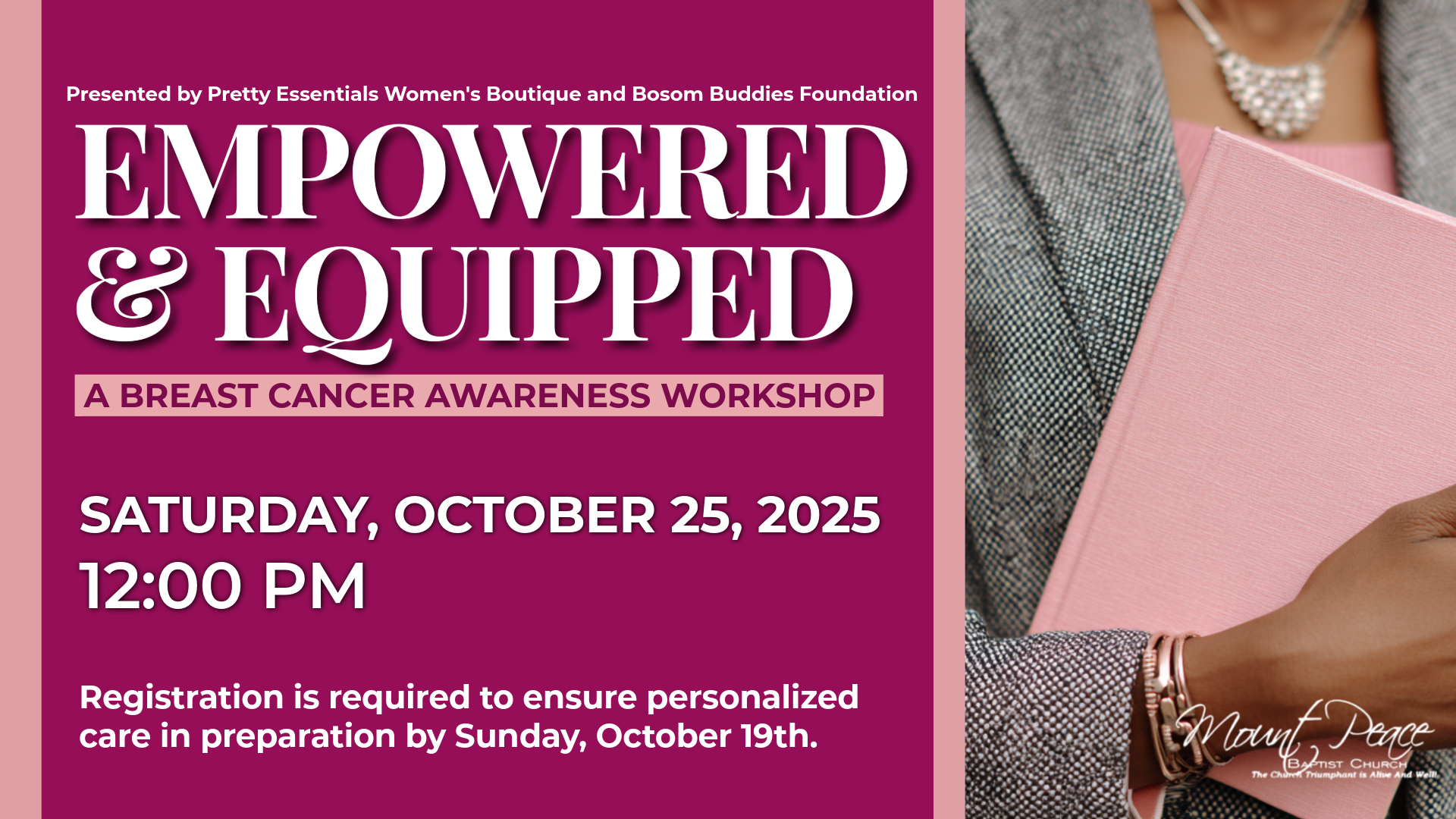 The Women’s Fellowship Ministry is sponsoring A Breast Cancer Awareness Workshop Presented by Pretty Essentials Women's Boutique and Bosom Buddies Foundation on Saturday, October 25th at 10:00am.